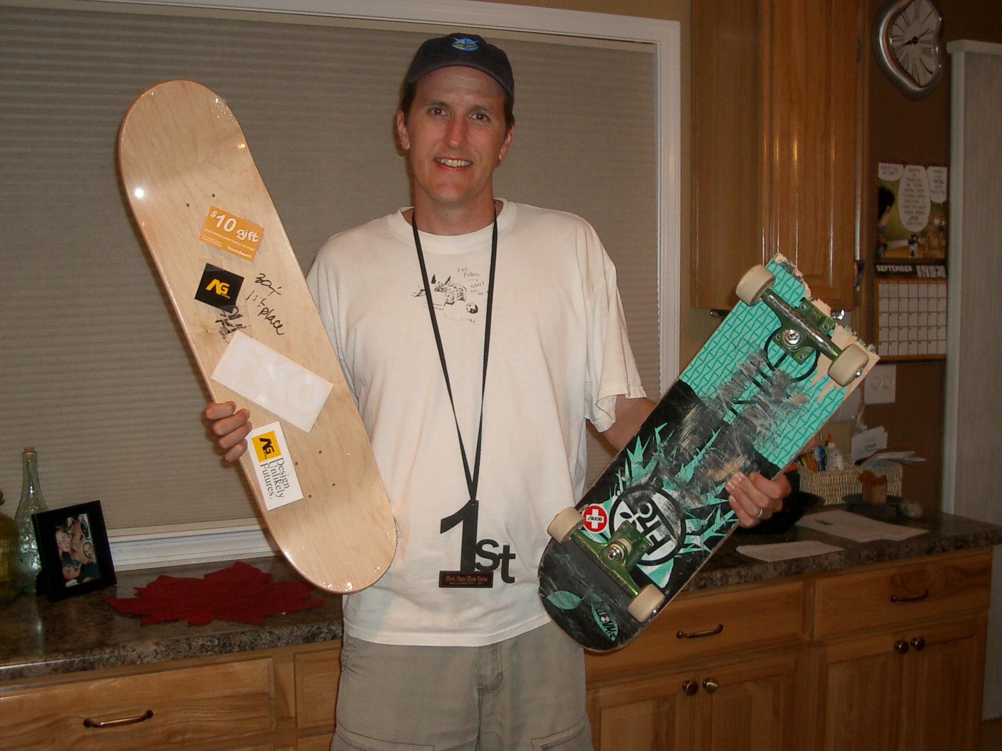 I won 1st in the 30+ division at a Skateboard competition this weekend.